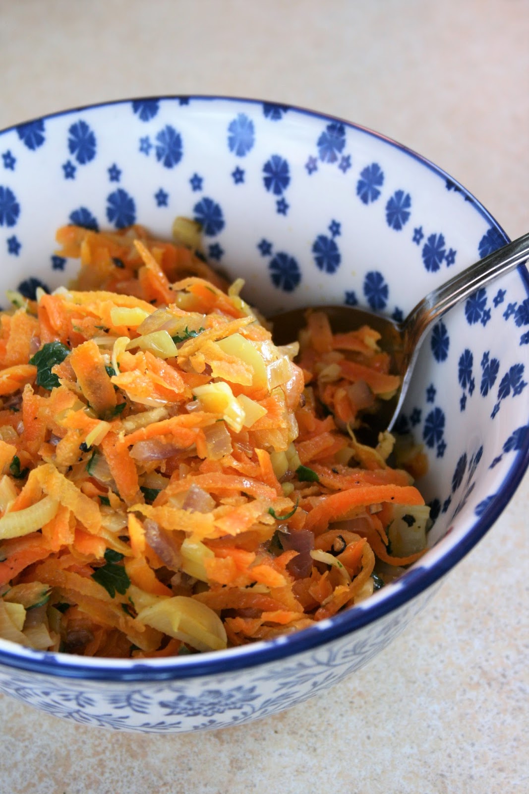 Pora i cebulę kroję w drobną kostkę, przekładam na patelnię z rozgrzanym olejem, lekko solę i smażę do zeszklenia. Marchew ścieram na tarce z grubymi oczkami, dorzucam do podsmażonych warzyw. Chwilę smażę, po czym dolewam odrobinę wody i przykrywam patelnię - na ok. 5 minut. W tym czasie marchewka powinna zmięknąć. Dodaję przeciśnięty przez praskę czosnek, posiekaną natkę pietruszki, i całość doprawiam do saku solą i pieprzem. Farsz również pozostawiam do przestygnięcia.
