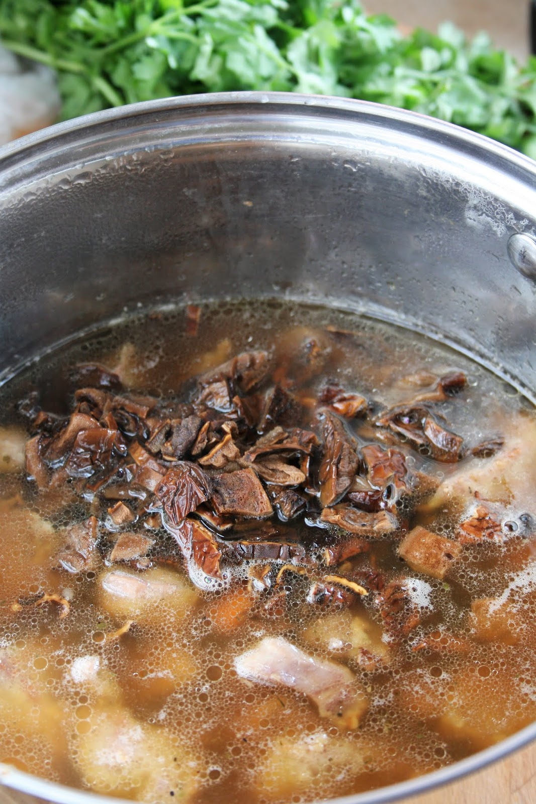 Wlewam wodę do garnka, dodaję pokrojoną w kawałki marchewkę oraz suszone grzyby, a także ziele angielskie. Zagotowuję pod pokrywką, zmniejszam ogień i gotuję dalej.