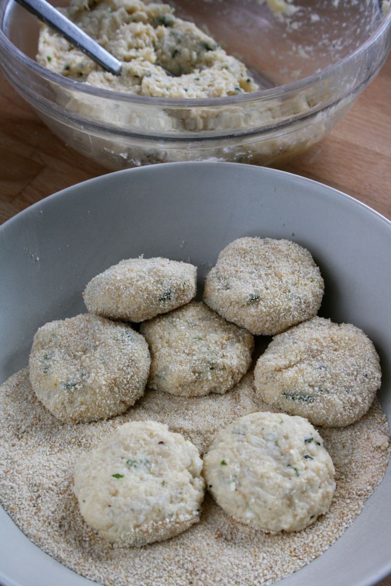 Formuję kulki wielkości orzecha włoskiego, spłąszczam je lekko, każdą panieruję w bułce tartej.